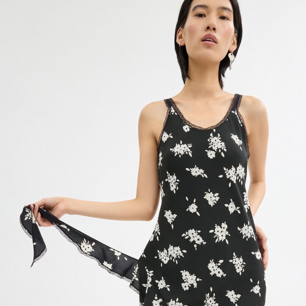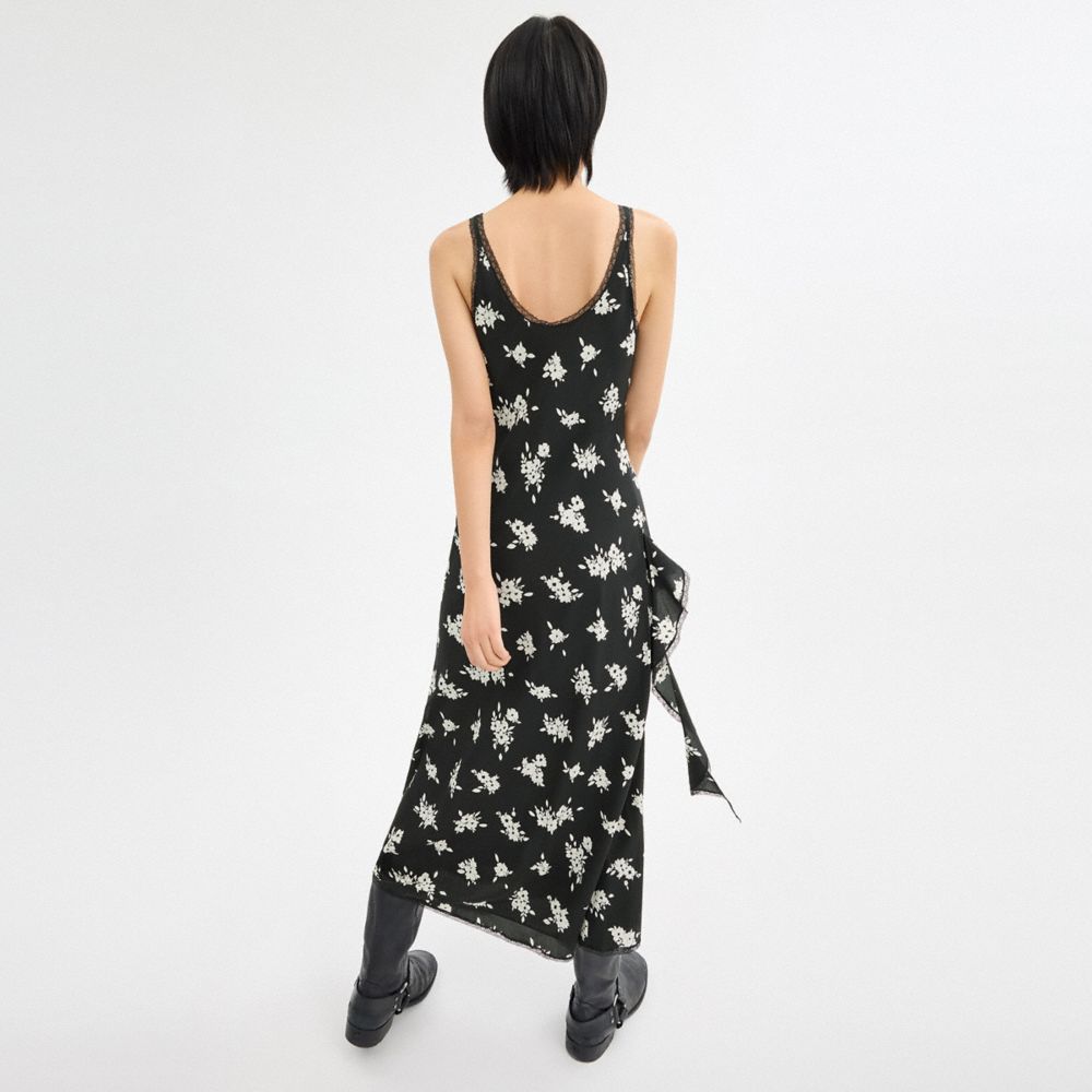 :: Coach Long Floral Ruffle Dress Zwart Wit Gekleurd | COH866064
