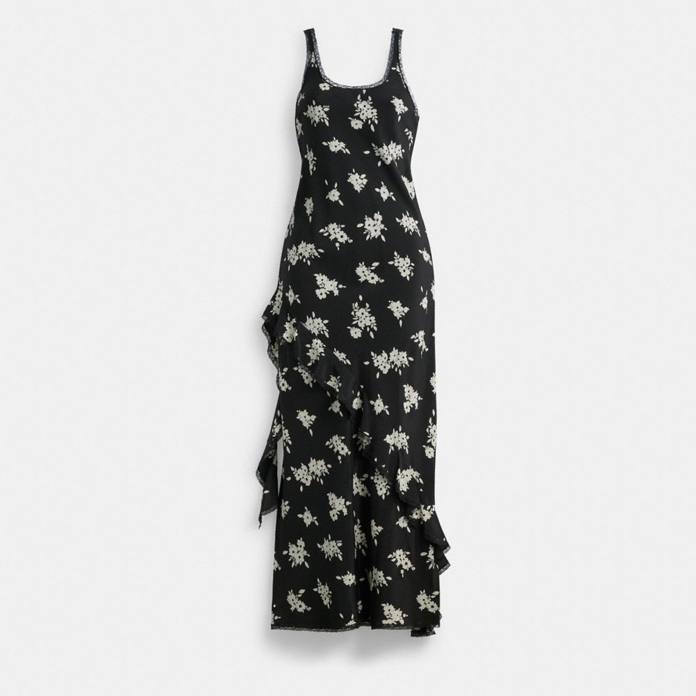 Coach Long Floral Ruffle Dress Zwart Wit Gekleurd | COH866064